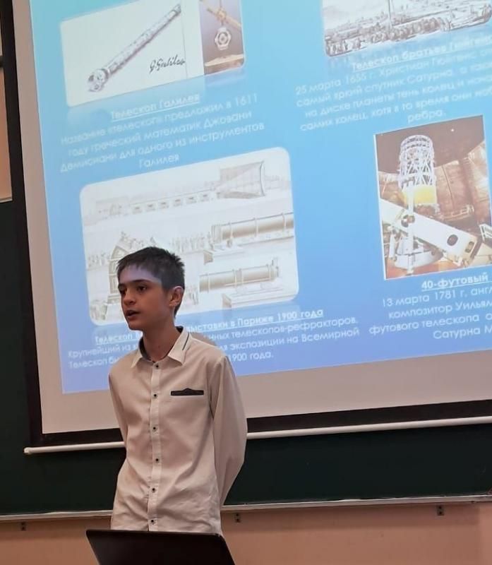 Наши школьники представили на конференции глубокие и содержательные доклады по ключевым темам астрофизики: «Космология и Большой взрыв», «Черные дыры», «Темная материя», «Пульсары», «Использование зрительной трубы для наблюдения за небесными телами», «Спектроскопические датчики и анализаторы. Собственный датчик углекислого газа для космических станций и поселений на Марсе».