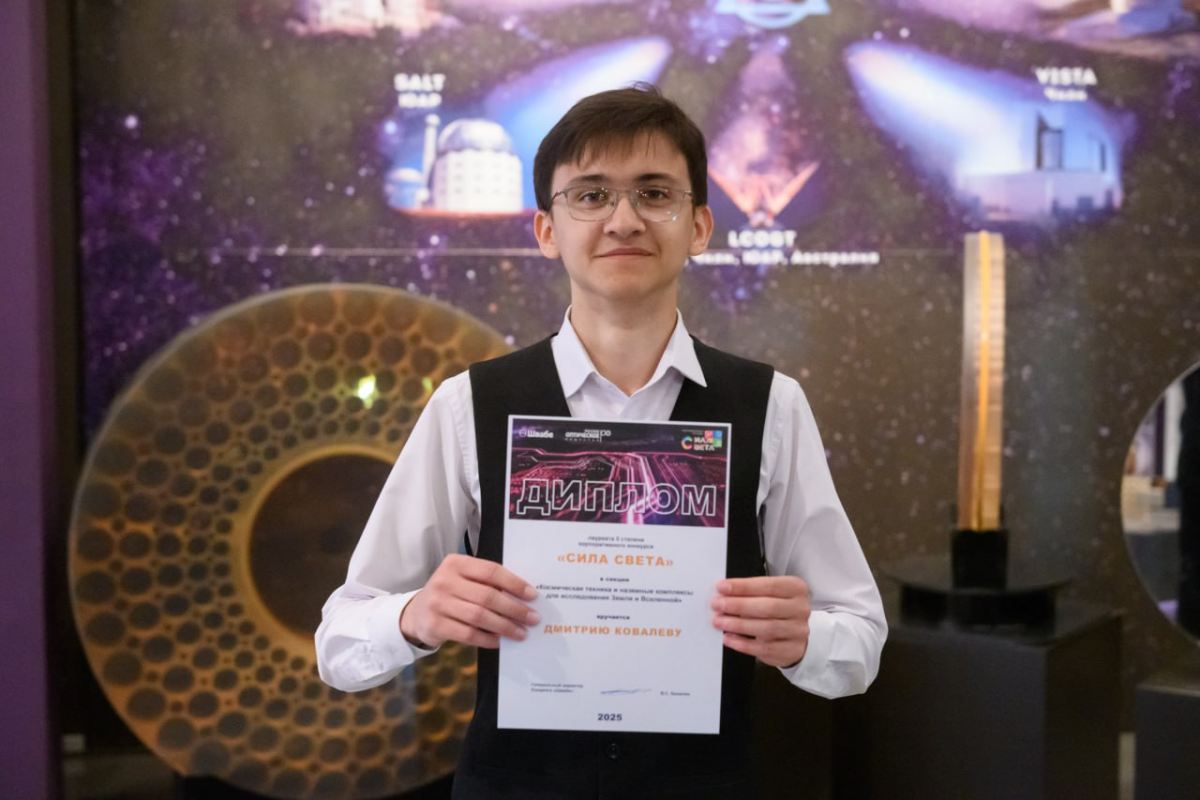 В номинации «Космическая и наземная техника для изучения Земли и Вселенной» второе место занял Ковалёв Дмитрий, ученик 9 классы гимназии №7 с проектом «Разработка модели планетохода с манипулятором для ремонта малых космических тел». В результате реализации проекта Дмитрий Ковалёв создал с использованием 3Д принтера работающий прототип планетохода с пультом управления и записывающей камерой. Для решения задач управления манипулятором участник самостоятельно осуществил программирование ровера и виртуального джойстика, им были приняты оригинальные решения для успешной реализации проекта. В будущем Дмитрий мечтает стать инженером-робототехником или IT-инженером. А пока он с удовольствием участвует в олимпиадах по информатике, занимается созданием игр и 3D-моделированием, разработкой нейросетей. Дмитрий дважды становился победителем Лыткаринских чтений по космонавтике, астрономии и оптики «Сила света». С помощью чтений и конкурса «Сила света» Дмитрий стал на шаг ближе к своей мечте!