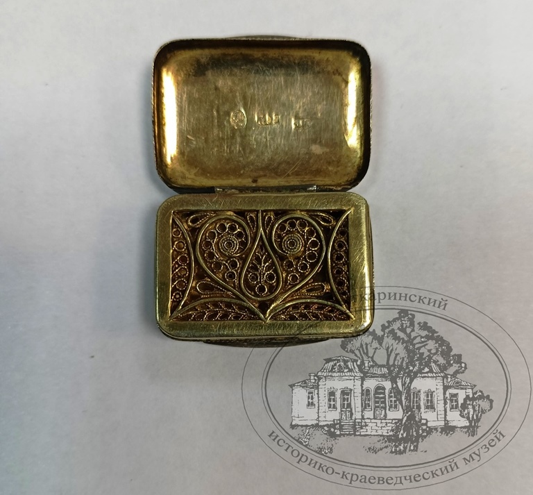 Миниатюрная прямоугольная коробочка из белого металла с откидной верхней крышкой и растительной гравировкой была предназначена для нюхательных солей и уксуса. Появились они в конце XVIII века и были популярны до середины XIX века при обмороках, которые случались в те времена с дамами довольно часто. Их причинами становились тесные корсеты и ткани, выкрашенные с применением вредных химических соединений, куда входил мышьяк или свинец. Поэтому такой аксессуар был незаменим и носился с собой практически постоянно, ведь в случае необходимости благодаря ему можно было привести себя в чувство. Под решеткой или перфорированной крышкой находились крошечные кусочки губки, пропитанные различными нюхательными солями (в составе были соли аммония), уксусом или нашатырем, имевшие довольно резкий запах. Как только человек чувствовал недомогание, открывалась крышечка и делался вдох.