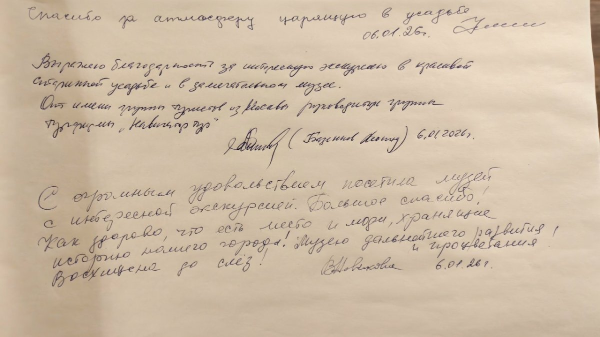 «Выражаем благодарность за интересную экскурсию в красивой старинной усадьбе и в замечательном музее. От имени группы туристов из Москвы руководитель группы турфирмы «Навигатор тур».
