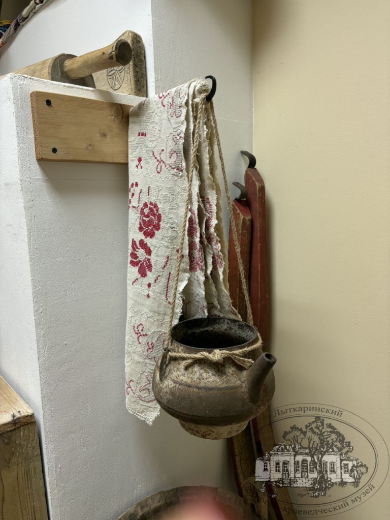 В этот раз мы хотим рассказать о рукомойнике XIX века в виде необычной формы чугунка. К нему с двух сторон прикреплены носики, как у чайника, а с двух других – ручки для подвешивания. Это сосуд с водой, предназначенный для умывания и мытья рук. В отличие от чайника, такие рукомойники на подвесе обычно имеют два носика-«рыльца», зачастую украшенных головами животных, по одному с каждой стороны от ручки. Согласно словарю Даля, «подвесной гончарный рукомойник с двумя ушками и рыльцами накрест» раньше назывался «бараном».