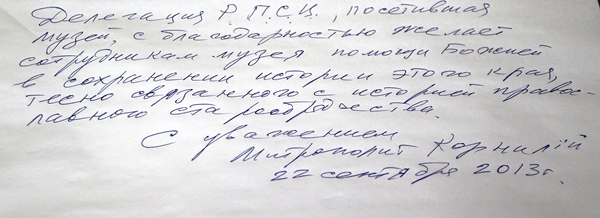 Митрополит Корнилий выразил благодарность устроителям выставки и оставил памятную запись в книге музея: «Делегация РПСЦ, посетившая музей, с благодарностью желает сотрудникам музея помощи Божией в сохранении истории этого края, тесно связанного с историей православного старообрядчества. С уважением, Митрополит Корнилий. 22 сентября 2013 г.»