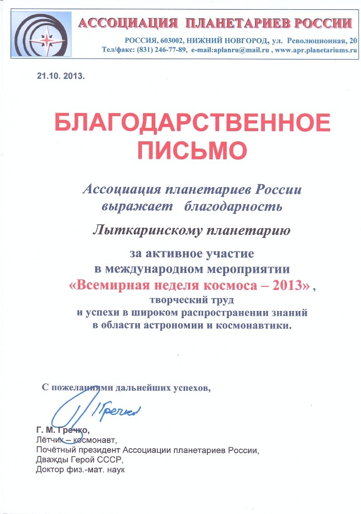 Ассоциация планетариев России отметила активную работу Лыткаринского планетария по популяризации достижений космонавтики среди молодежи во время проведения Всемирной недели космоса-2013. С 4 по 10 октября в Лыткаринском музее была проведена серия интеллектуальных игр  «Космос-далекий и близкий». Это мероприятие было зарегистрировано на официальном сайте Всемирной космической недели и стало участником международной акции. Благодарственное письмо было вручено заведующей отделом «Планетарий» М.Н. Казанцевой в торжественной обстановке на Международном фестивале полнокупольных программ для планетариев, проходившем в Ярославле с 21 по 23 октября.