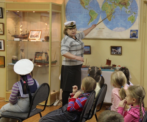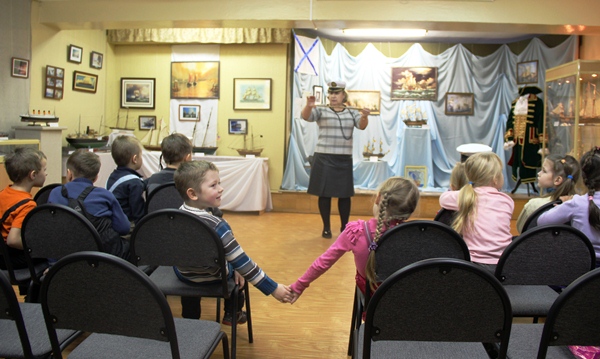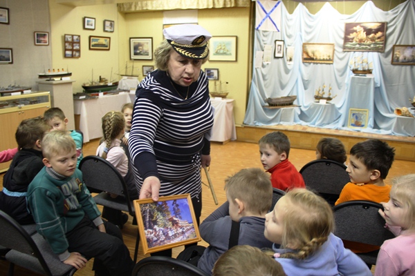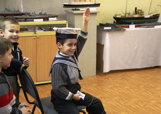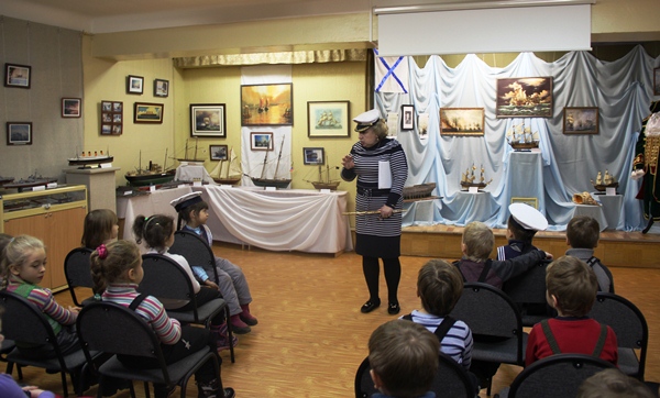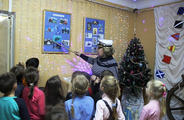 Детская программа «Новый год на корабле» стартовала в выставочном зале музея, где собрано большое количество макетов кораблей, подводных лодок, живописных полотен с изображением морских сражений, парусников, круизных лайнеров и т.д.