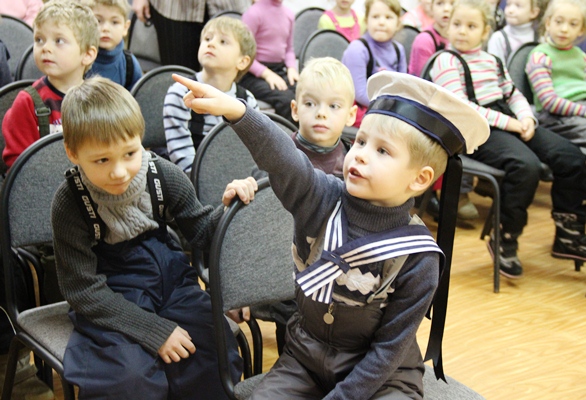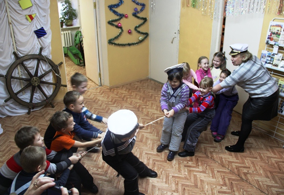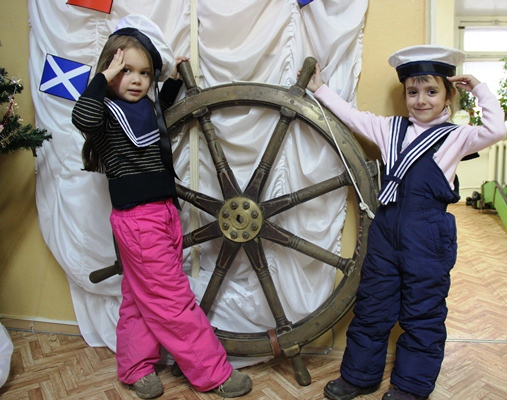 Для дошкольников и учащихся начальной школы морское путешествие начинается с музыки из кинофильма «Дети капитана Гранта», знакомства с семафорной азбукой, веселых конкурсов юных капитанов, боцманов, лоцманов и экипажей кораблей. Увлекательное морское путешествие по странам и континентам, начиная с Древнего Египта и до наших дней, продолжает мультипликационный фильм о праздновании Нового года в Антарктиде, на Полярной станции, а завершает – Морской лингвистический футбол. Проигравший экипаж, увы, получает домашнее задание! Общая фотография на фоне елки, паруса и корабельного штурвала ставит не точку, а многоточие в новогодней программе, потому что на детских лицах улыбки, значит, впереди очередное путешествие. Куда? Пока секрет!