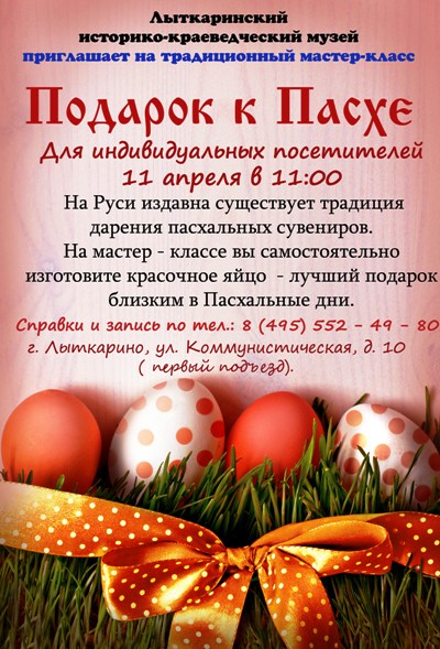 В преддверии праздника все желающие могут прийти в музей, где вам расскажут о христианских традициях и разных способах изготовления пасхального сувенира – «писанки», а также вы самостоятельно можете расписать его воском своими руками.