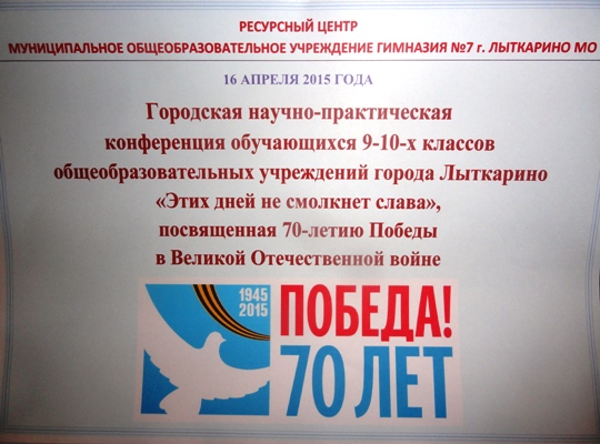 Ежегодная школьная конференция НОУ (научное общество учащихся) в этом году проходила накануне празднования 70-летия Победы советского народа в Великой Отечественной войне, что и предопределило ее тему. На базе ресурсного центра в гимназии № 7 прошли слушания исследовательских проектов учеников всех образовательных учреждений города Лыткарино по 9 секциям. Сотрудники Лыткаринского историко-краеведческого музея приняли участие в работе научно-практической конференции в качестве членов жюри.