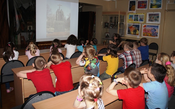 Особое внимание на этой познавательной встрече уделили окладу рукописной книги: как и из чего его изготавливали, чем украшали, как работали над ним живописцы, златописцы, златокузнецы, ювелиры. Дети с удовольствием рассматривали иллюстрации первых печатных азбук.