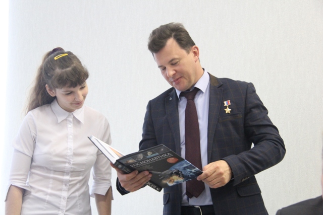 Школьники попросили рассказать космонавта о его работе. Роман Юрьевич Романенко — представитель космической династии, дважды летал в космос, оба раза в качестве командира экипажа, совершил один выход в открытый космос, в настоящее время работает в Госдуме РФ, курирует многие вопросы по строительству космодрома  «Восточный» и города-спутника Циолковский. Открытый, доброжелательный, с чувством юмора он сразу расположил к себе ребят. Они задавали много вопросов, на которые космонавт отвечал подробно и развернуто. Школьники интересовались по какой программе готовят космонавтов в настоящее время, какие традиции соблюдаются в отряде космонавтов и верят ли они в суеверия, какое было самое сильное его личное впечатление во время полета, о чем больше всего скучал в космосе, как стал художественным персонажем детской книжки и хотел бы, чтобы его дети продолжили космическую династию. Поток вопросов был неиссякаем  и во время продолжительного общения ребята смогли получить исчерпывающие ответы. Все желающие имели возможность сфотографироваться с космонавтом и получить у него автограф.