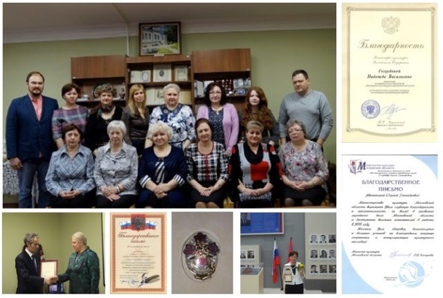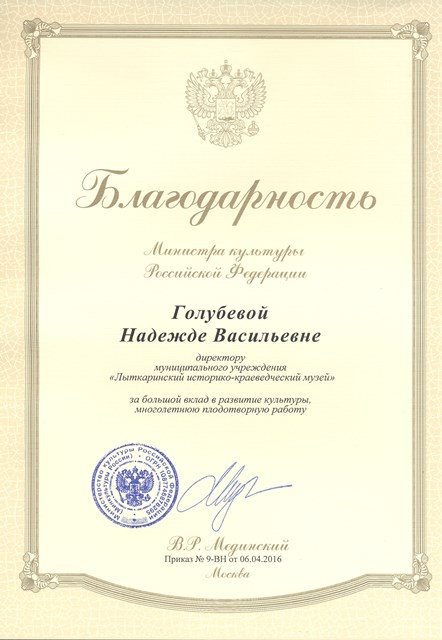 Директор музея Н.В. Голубева награждена Благодарностью Министра культуры Российской Федерации В.Р. Мединского за большой вклад в развитие культуры и многолетнюю плодотворную работу. Заведующей отделом «Планетарий» Лыткаринского историко-краеведческого музея М.Н. Казанцевой Губернатором Московской области А.Ю. Воробьевым присвоено звание «Заслуженный работник культуры Московской области». М.Н. Казанцева за 16 лет работы в культуре достигла больших результатов в работе по сохранению и популяризации культурного наследия города Лыткарино и Московской области. Церемонию награждения проводила Министр культуры Московской области О.В. Косарева.