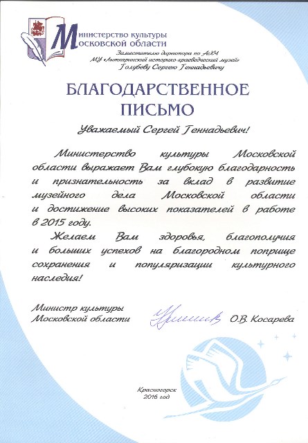 В Государственном мемориальном музыкальном музее-заповеднике П.И. Чайковского 19 мая прошло торжественное собрание музейных работников Московской области, посвященное Международному Дню музеев. Министр культуры Московской области О.В. Косарева принимала участие в торжественной церемонии награждения лучших музейных работников за 2015 год. Заместителю директора С.Г. Голубеву было вручено Благодарственное письмо Министра культуры Московской области за вклад в развитие музейного дела Московской области и достижение высоких показателей в работе.