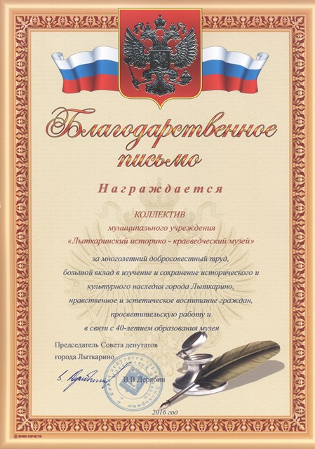 На праздничном мероприятии, посвященном 40-летию Лыткаринского историко-краеведческого музея, Глава города Лыткарино Е.В. Серёгин поздравил коллектив и вручил Грамоты лучшим работникам музея. От Совета депутатов города коллектив музея получил Благодарственное письмо за многолетний добросовестный труд, большой вклад в изучение и сохранение исторического и культурного наследия города Лыткарино, нравственное и эстетическое воспитание граждан, просветительскую работу и в связи с 40-летием образования музея.
