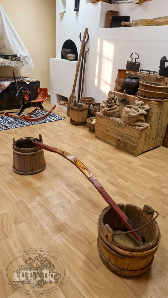 Правы были те, кто ответил на загадку, что это коромысло – деревянное приспособление в виде длинной палки или дуги для ручного ношения двух ведер с водой или других грузов. С помощью этого предмета носили воду для питья, бани, чтобы напоить скот, на речку в корзинах несли полоскать белье, мыть огурцы, вымачивать грибы. Воду носили вот в таких ушатах, которые мы также видим на фотографии – больших сосудах, на верхних частях которых с противоположных сторон расположены выступы с отверстиями или ручки («уши»). Отсюда пошла русская поговорка «Облить (окатить) ушатом холодной воды».